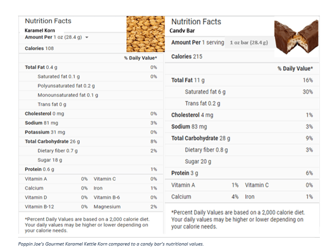Just look at the nutritional values for 1-ounce of Poppin Joe’s Gourmet Karamel Kettle Korn compared to a 1-ounce candy bar.